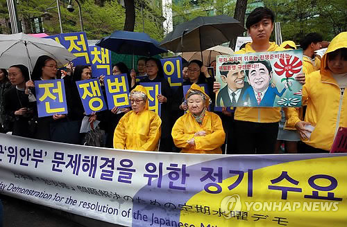 | △ 비 오는 날의 수요집회 (서울=연합뉴스) 박동주 기자 = 29일 서울 종로구 일본대사관 앞에서 열린 일본군 '위안부' 문제 해결을 위한 정기수요집회에서 참가자들이 일본의 사죄를 촉구하는 메시지가 담긴 손팻말을 들고 있다. 2015.4.29 pdj6635@yna.co.kr |