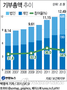 기부 총액에서 개인의 기부금이 차지하는 비율도 2006년 65.7%에서 2013년 62.7%로 줄었다.