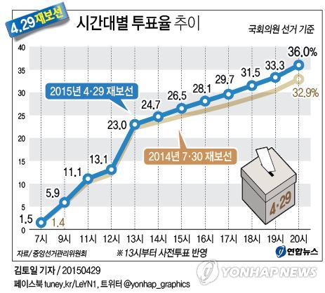 | △ <그래픽> 4·29 재보선 시간대별 투표율 추이(잠정) (서울=연합뉴스) 김토일 기자 = 중앙선거관리위원회는 4·29 재·보궐선거일인 29일(잠정) 국회의원 선거구 4곳의 투표율이 36.0%(사전투표 반영)로 집계됐다고 밝혔다. |