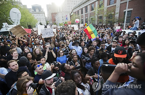 | △ (볼티모어 AP=연합뉴스) 경찰 구금중 숨진 프레디 그레이의 사망사건에 항의하는 시위가 29일(현지시간)에도 볼티모어 등지에서 이어졌다. 수백명의 시위자들은 신속한 정의 실현을 요구하며 시내를 행진했다. |