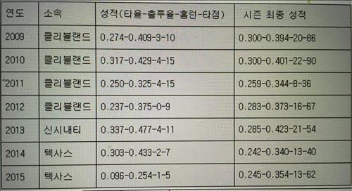 홈런 1개, 5타점을 올린 추신수는 볼넷을 7개 고르는 데 그쳐 장기인 출루율에서도 0.254로 맥을 못 췄다.