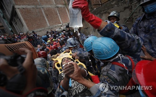 (카트만두 AP=연합뉴스) 네팔 대지진 5일 만인 30일(현지시간) 카트만두의 무너진 건물 잔해에 갇혀 있던 15세 소년이 미국과 네팔 구조팀에 무사히 구조됐다.