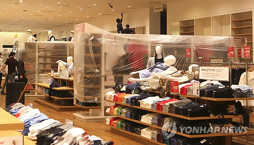 롯데와 유니클로는 매장을 폐쇄하고 물에 젖은 내부 집기를 정리하고 물기를 제거하고 있다.