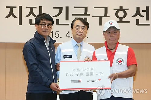 | △ 한적 네팔 지진 긴급구호선발대 출정식 (서울=연합뉴스) 박지호 기자 = 28일 오후 서울 중구 소파로 대한적십자사에서 열린 '대한적십자사 네팔 지진 긴급구호선발대 출정식'에서 구호물품을 후원한 밀레의 박용학 상무(왼쪽)가 이영선 대한적십자사 부총재(가운데), 엄홍길 긴급구호대장과 포즈를 취하고 있다. 2015.4.28 jihopark@yna.co.kr |