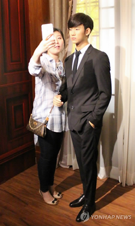 | △ 홍콩 마담투소에 한류존…김수현·닉쿤 밀랍인형 공개 (홍콩=연합뉴스) 최현석 특파원 = 유명 밀랍인형 박물관인 마담투소 홍콩이 30일 한류존을 개관했다. 3천만 홍콩달러(약 41억6천만원)가 투자된 한류존에는 배용준과 김수현, 슈퍼주니어 최시원, 동방신기 유노윤호, 최강창민, 2PM 닉쿤 등 한류 스타의 밀랍인형이 전시된다. 사진은 마담투소 홍콩 관람객들이 한류 스타의 밀랍인형과 기념사진을 찍는 모습. 2015.4.30 harrison@yna.co.kr |