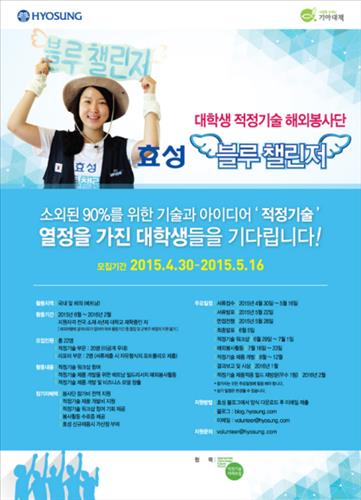 (서울=연합뉴스) 김연숙 기자 = 효성[004800]은 대학생 글로벌 봉사단 '효성 블루챌린저(Blue Challenger)'를 모집한다고 1일 밝혔다.