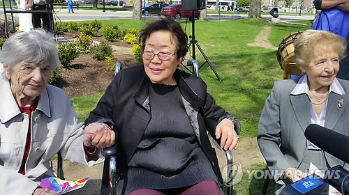 | △ 홀로코스트 생존 할머니 만난 이용수 할머니 (뉴욕=연합뉴스) 김화영 특파원 = 30일(현지시간) 미국 뉴저지 주 해켄색의 버겐카운티 기림비 앞에서 일본군 위안부 피해자인 이용수 할머니가 홀로코스트 생존 할머니들과 만나고 있다. 왼쪽부터 홀로코스트 생존자인 에델 켓츠, 이용수 할머니, 홀로코스트 생존자인 애니타 와이즈보드 할머니. quintet@yna.co.kr |