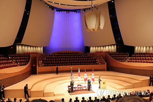 | △ 객석 절반 가까이 텅 빈 채 연설하는 아베 (스탠퍼드<미국 캘리포니아주>=연합뉴스) 임화섭 특파원 = 아베 신조(安倍晋三) 일본 총리(무대 오른쪽 단상)가 30일(현지시간) 미국 스탠퍼드대에서 강연을 하고 있다. 이날 주최측은 강연장인 '빙 콘서트 홀'의 합창단석, 무대 뒷면 테라스석과 옆면 테라스석에 청중을 입장시키지 않았고, 842석의 객석 중 절반 가까이가 텅 빈 상태로 강연이 진행됐다. 연설 방청은 사전에 초청장을 받은 인사들에게만 허용됐으며, 청중이나 기자들과의 질의응답은 없었다. solatido@yna.co.kr |