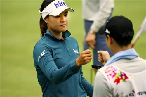 | △ 전인지(하이트진로)가 11번홀에서 버디를 잡은 뒤 캐디와 하이파이브를 하고 있다.<<사진제공=KLPGA>> |