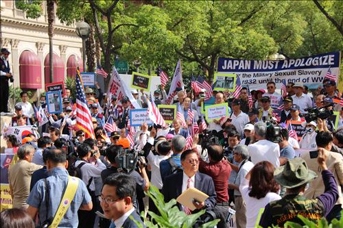 한인 단체들은 집회에서 제2차 세계대전 당시 일분군 위안부 강제동원을, 중국인 단체들은 일본의 난징(南京) 대학살 등을 각각 집중 부각시켰다.