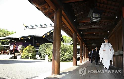 | △ (도쿄 AP=연합뉴스) 일본의회 의원들이 4월 22일 야스쿠니(靖國)신사에서 매년 거행되는 봄 제사 참배를 위해 신관을 따라가고 있다. |