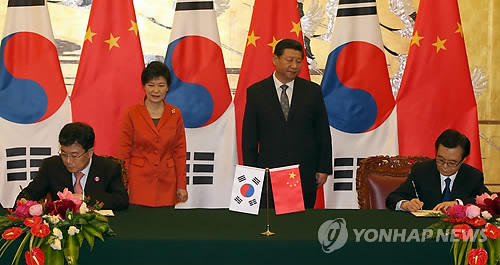 | △ 작년 11월 10일 오전 중국 베이징 인민대회당에서 박근혜 대통령과 시진핑 중국 국가주석이 지켜보는 가운데 윤상직 산업통상자원부 장관과 가오후청 중국 상무부장이 한중 자유무역협정(FTA)에 서명하고 있다. |