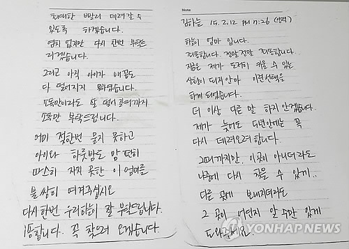 | △ 베이비박스에 남긴 편지 (서울=연합뉴스) 지난 2월 하늘 엄마가 태어난 지 4일 된 아이를 베이비박스에 맡기며 남긴 편지. 2015.5.3 << 주사랑공동체교회 제공 >> dohh@yna.co.kr |