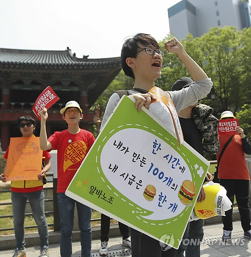 | △ 구호 외치는 알바노조 (서울=연합뉴스) 이승민 기자 = 근로자의 날인 1일 서울 종로 보신각 앞에서 열린 아르바이트 노동자 처우 개선을 위한 '알바 데이' 행사에서 참석자들이 구호를 외치고 있다. 2015.5.1 logos@yna.co.kr |
