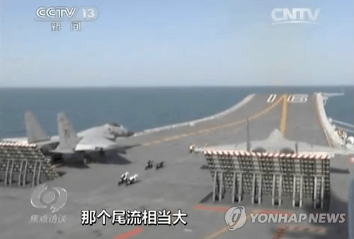 (베이징=연합뉴스) 홍제성 특파원 = 중국의 첫 항공모함 랴오닝(遼寧)호의 함재기 '젠(殲)-15'가 이착륙하는 영상이 관영 중국중앙(CC)TV를 통해 처음으로 방영됐다.