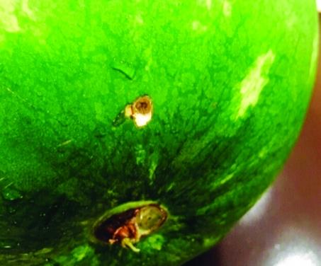 이 구멍이 수박 표면에서 부화한 곤충의 알이 수박 속으로 들어가 번데기가 된 흔적이라는 추정도 나오고 있다.