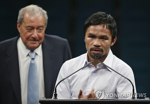 | △ 메이웨더와 경기 후 기자회견하는 매니 파키아오 (AP=연합뉴스 자료사진) |