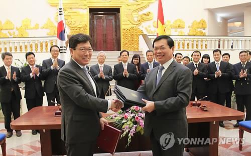 윤상직 산업통상자원부 장관과 부 휘 황 베트남 산업무역부 장관은 5일 베트남 수도 하노이에서 한·베트남 자유무역협정(FTA)에 정식 서명한 뒤 기자회견을 통해 이같이 밝혔다.