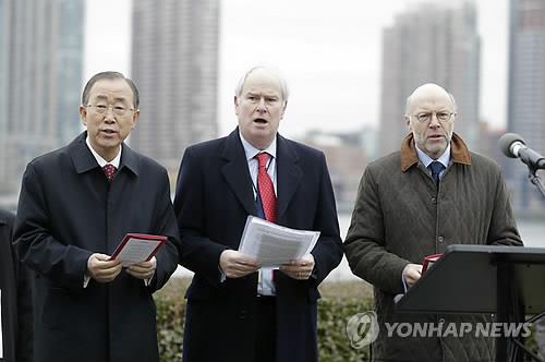 | △ (왼쪽부터) 반기문 유엔 사무총장, 마크 라이얼 그랜트 유엔 주재 영국 대사, 하랄트 브라운 독일 대사가 2014년 12월 5일(현지시간) 뉴욕 유엔본부에서 열린 제1차 세계대전 '크리스마스 휴전' 100주년 기념식에 참석하고 있다. (EPA=연합뉴스DB) |