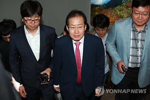 | △ 집무실 향하는 홍준표 지사 (창원=연합뉴스) 이정훈 기자 = '성완종 리스트'에 오른 홍준표 경남도지사가 6일 오전 출근해 기자들에 둘러싸인 채 집무실로 향하고 있다. |