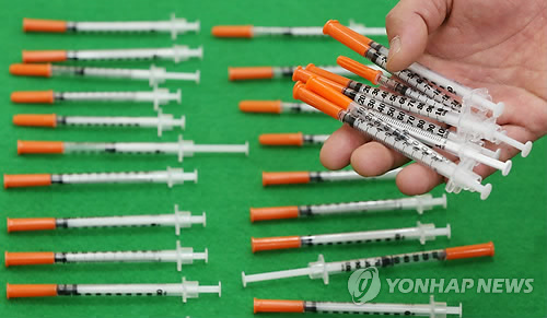 | △ 경찰이 압수한 필로폰 투약 주사기 (서울=연합뉴스) 홍해인 기자 = 서울지방경찰청 광역수사대 마약수사계는 6일 랜덤 채팅 어플을 통해 부녀자들을 만나 필로폰을 판매, 투약한 혐의로 판매책 신모씨 부부 등 피의자 27명을 검거했다고 밝혔다. 사진은 경찰이 피의자들로부터 압수한 필로폰 투약 일회용 주사기. 2015.5.6 hihong@yna.co.kr |