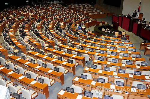 | △ 박상옥 대법관 임명동의안 처리 야당 불참 (서울=연합뉴스) 백승렬 기자 = 새정치민주연합과 정의당 의원들이 6일 국회 본회의에서 박상옥 대법관 임명동의안 처리에 불참한 가운데 본회의가 열리고 있다. srbaek@yna.co.kr |