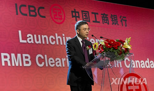 | △ 지난 3월 중국공상은행이 캐나다 토론토에 가진 위안화 청산은행 오픈 기념식 모습(자료사진) |