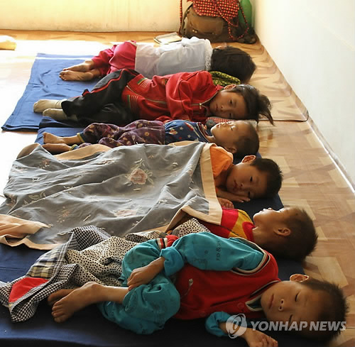 | △ 나란히 누워 있는 지친 표정의 북한 어린이들 (로스앤젤레스=연합뉴스) 수해 피해를 당한 북한의 한 지역 병원에 영양실조에 걸린 북한 어린이들이 나란히 누워 있다. 이 사진은 '머시코' 등 미국의 5개 구호 단체 대표들이 지난 9월4일부터 10일까지 북한을 방문했을 때 찍은 것이다. 2011.10.2 khoon@yna.co.kr |