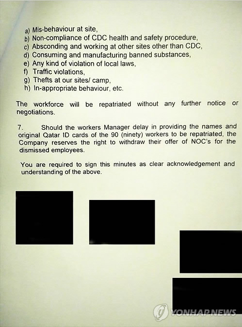 | △ 카타르 CDC와 주카타르 북한 대사관의 회의록 (서울=연합뉴스) 미국의소리(VOA) 방송은 카타르 건설회사 CDC와 주카타르 북한 대사관 관계자의 회의록을 입수해 CDC가 고용한 북한 노동자 90명을 근로규정 위반 문제로 해고했다고 7일 보도했다. 사진은 VOA가 입수한 회의록. 2015.5.7 <<VOA 제공>> nkphoto@yna.co.kr |