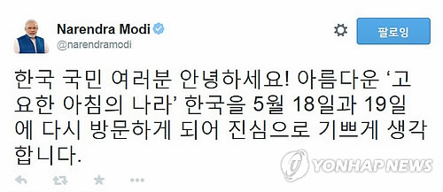 (뉴델리=연합뉴스) 나확진 특파원 = 오는 18일 한국을 방문하는 나렌드라 모디 인도 총리가 트위터에 한글로 인사를 남겼다.
