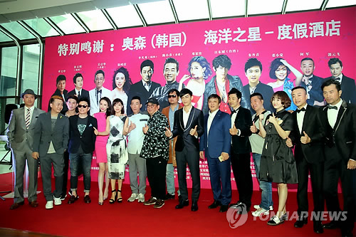| △ 제주서 제작발표회 하는 중국 코메디 영화 (서귀포=연합뉴스) 고성식 기자 = 제주에서 촬영 중인 중국의 액션·코메디 영화인 '메이지화'(바보계획)의 투자·제작사와 출연진·스태프들이 7일 서귀포시 오션스타콘도에서 제작발표회를 열고 카메라 촬영에 포즈를 취하고 있다. 왼쪽에서 네 번째 한국배우 이범수, 왼쪽에서 일곱 번째와 여덟 번째가 각각 배우 천소췬과 감독 썬다오. |