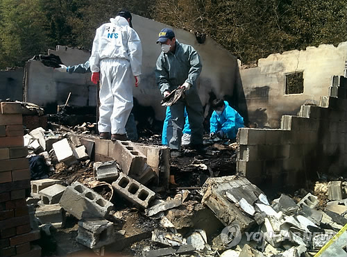 | △ 훈민정음 상주본이 있으려나 (상주=연합뉴스) 손대성 기자 = 30일 경북 상주시 낙동면 배모(52)씨 집에서 국립과학수사연구원과 경북지방경찰청 관계자가 화재 원인을 규명하기 위한 감식 작업을 벌이고 있다. 배씨는 국보급으로 평가되는 훈민정음 해례본 상주본을 소유한 것으로 알려졌다. 그의 집은 26일 불로 모두 탔다. 2015.3.30 sds123@yna.co.kr |