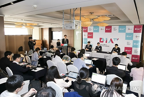 | △ 'DIA(다이아) TV' 론칭 기자간담회 (서울=연합뉴스) 이덕재 CJ E&M 방송콘텐츠 부문 대표(가운데)와 관계자들이 7일 오전 서울 소공동 롯데호텔에서 새로운 사업모델 발굴, 플랫폼 확대, 글로벌 진출 등 3대 지원을 주요 내용으로 하는 'DIA(다이아) TV' 론칭 기자간담회를 하고 있다. 2015.5.7 << CJ E&M 제공 >> photo@yna.co.kr |