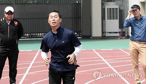 | △ 끝까지 뛰어보자 (청주=연합뉴스) 김형우 기자 = 7일 오전 청주시 종합운동장에서 이뤄진 청주 동부소방서 소방관들의 체력평가에서 한 50대 소방관이 왕복달리기를 하고 있다. 2015.5.7 vodcast@yna.co.kr |
