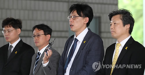 | △ 기자회견하는 MBC 노조원들 (서울=연합뉴스) 이승민 기자 = 2012년 공정방송 요구파업 당시 업무방해 등의 혐의로 기소된 정영하 전 MBC 노조위원장을 비롯한 노조원들이 7일 오후 서울 서초구 서울고등법원에서 열린 2심에서 무죄를 선고 받은 뒤 기자회견을 하고 있다. |