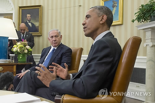 | △ 지난해 10월 1일 미국 백악관에서 열린 미-이스라엘 정상회담 당시의 버락 오바마 대통령(오른쪽)과 베냐민 네타냐후 이스라엘 총리의 모습. EPA/MICHAEL REYNOLDS |