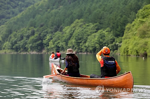 | △ (서울=연합뉴스) 성연재 기자 = 수상레저 인구가 급증하고 있다. 사진은 강원도 홍천 마곡유원지에서 카누를 타는 사람들.2015.5.8 polpori@yna.co.kr |