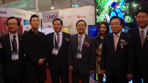 | △ 왼쪽부터 허원재 방송통신위원회 부위원장, 장혁 홍보대사, 배덕광 새누리당 소속 국회의원, 이남기 KT스카이라이프 사장, 남규리 홍보대사, 서병수 부산시장, 박창식 새누리당 소속 국회의원 |