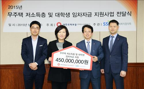 (서울=연합뉴스) 박인영 기자 = 대한주택보증은 8일 무주택 저소득층 및 대학생을 위한 임차자금 4억5천만원을 한국사회복지협의회에 전달했다고 밝혔다.