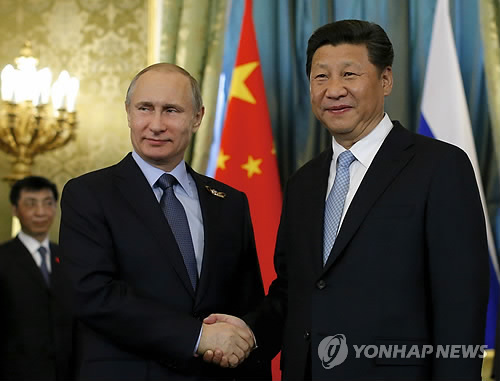 | △ 유라시아 대륙의 두 정상 (모스크바 AP=연합뉴스) 시진핑(習近平)) 중국 국가주석이 8일(현지시간) 러시아를 방문, 모스크바 크렘린궁에서 블라디미르 푸틴 러시아 대통령과의 정상회담에 앞서 포즈를 취했다. |