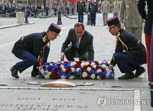올랑드 대통령은 개선문 무명용사의 묘를 찾아 헌화했다.