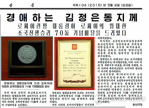 (서울=연합뉴스) 이상현 기자 = 러시아의 제2차 세계대전 승전 70주년을 기념해 북한과 러시아의 정상이 축전과 기념 메달을 주고받으며 변함없는 친선을 과시했다.