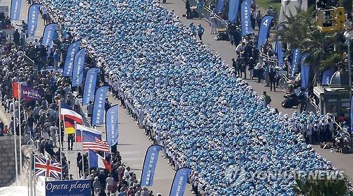 (니스<프랑스> AFP=연합뉴스) 중국의 손꼽히는 재벌 회사 톈사그룹(天獅集團) 직원 6천여명이 회사가 마련해 준 프랑스 단체여행을 즐기면서 8일(현지시간) 유명 휴양지 니스(Nice)에서 기네스 세계 기록을 수립, 눈길을 끌었다.