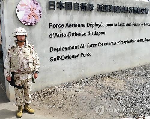 | △ 2015년 1월 20일(현지시간) 아프리카 지부티의 지부티 공항에 인접한 자위대 항공대 거점 외벽 앞에 자위대원이 서 있는 모습. (교도=연합뉴스) |