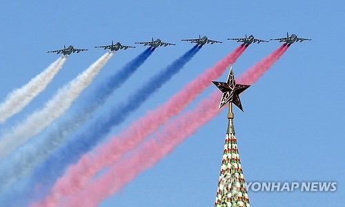 | △ (EPA=연합뉴스) 러시아 공군 전투기들이 7일, 모스크바 붉은광장에서 9일 열리는 2차 세계대전 승전기념식에서 선보일 축하비행을 연습하고 있다. 2015.5.7. |