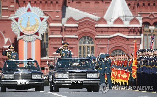 | △ (EPA=연합뉴스) 9일 러시아 모스크바 붉은광장에서 열린 2차대전 승전 70주년 기념식에서 러시아 국방장관이 부대사열을 하고 있다. 2015.5.9 |