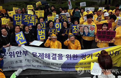 | △ <동북아 외교전쟁> 일본 사죄않고 폭주 (서울=연합뉴스) 일본은 보수와 우익 세력을 중심으로 지지 기반을 확고히 한 아베 신조 정권이 독주하면서 동북아시아의 갈등과 긴장을 키우고 있다. 아베 총리는 일본군 위안부 문제로 대표되는 역사 인식에서 시대에 역행하는 흐름을 조장하며 한국과 중국 사이에서 불협화음을 유발하고 있다. 사진은 지난달 주한 일본대사관 앞에서 열린 수요집회. 2015.5.7 << 연합뉴스DB >> photo@yna.co.kr |