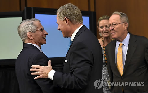| △ 지난해 9월 미 의회에서 앤서니 파우치(왼쪽) 미국 국립보건원(NIH) 알레르기·전염병 연구소장과 에볼라 대책 관련 대화를 나누는 리처드 버(왼쪽에서 두번째) 상원 정보위원장. (AP Photo/Susan Walsh) |