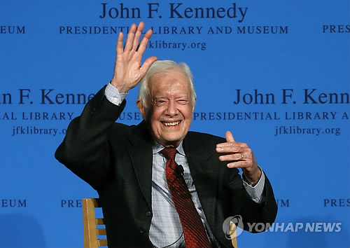 | △ (AP=연합뉴스) 지미 카터 전 대통령이 지난해 11월 20일(현지시간) 매사추세츠 주 보스턴 소재 케네디 대통령 도서관 주최의 한 포럼에 참석한 모습. 카터 전 미국 대통령은 이날 자신의 저서인 '실천을 위한 외침: 여성, 종교, 폭력과 권력'에 대해 얘기했다. 2014.11.20 |