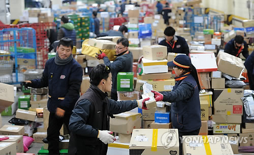 | △ 우체국 직원들이 분주히 택배 상자들을 처리하고 있다.(연합뉴스 자료사진) |